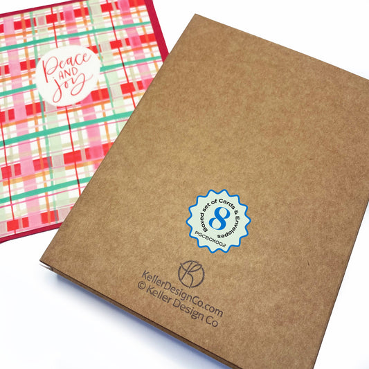 Boxed Set of 8 Cards-Peace and Joy (Pink/ Green) Plaid Greeting Cards